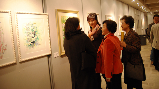 | ▲관람객들과 작품에 대해 이야기를 나누고 있는 김성혜 작가 | |