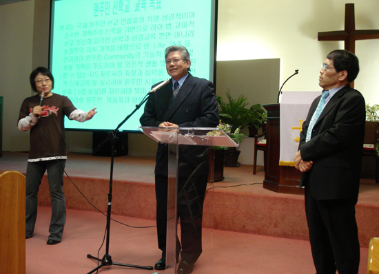 | ▲김혜택 목사가 원주신 신학교 건물 구입이 시급하다고 말했다. 스크린에 보이는 건물을 신학교 건물로 구입하고자 한다. 건물 구입을 위해 32만불이 필요하다. | |