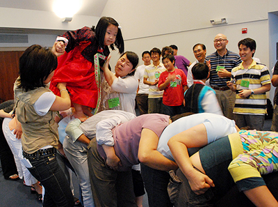구수한 노래 가락에 맞춰 예배를 인도하는 김승남 목사가 “강강수월~래”를 외치면 손을 잡고 발 장단을 맞추던 참석자들도 “강강수월~래”를 구수하게 외쳐댄다. 또 모든 어른들이 허리를 숙이고 한 줄을 만들면 조그만 아이가 등 위를 징검다리처럼 건너간다. 서로 손을 잡고 빙빙 돌며 몸을 부대끼는 민속놀이 마당에 어느새 성도들은 한 가족이 된다.