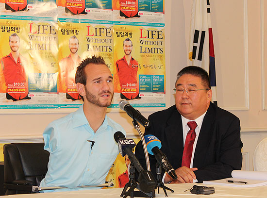 오는 10월 1일과 2일에 각각 주님의영광교회와 베델한인교회에서 오후 7시에 개최되는 ‘밀알장애인장학복지기금 마련을 위한 2011년 제 14회 밀알의 밤’에서 강연을 펼칠 예정인 닉 부이치치는 24일 오전에 JJ호텔에서 기자회견을 갖고, 자신이 체험한 무조건적인 하나님의 사랑에 대해 간증하며, 시종일관 “절망하거나 포기하지 말라”고 당부했다.