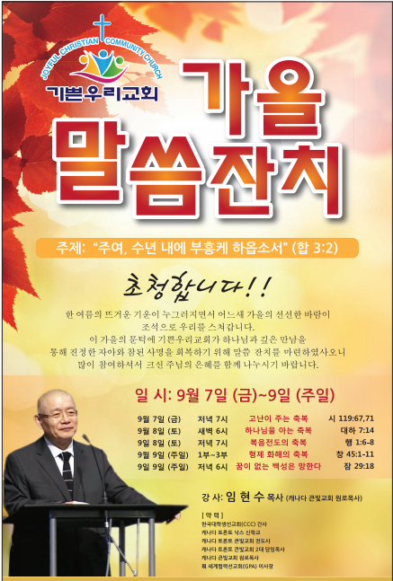글렌데일에 위치한 기쁜우리교회(담임 김경진 목사)는 캐나다 큰빛교회 임현수 원로목사를 초청해 “주여,수년 내에 부흥케 하옵소서” (합3:2)를 주제로 9월 7일(금)부터 9일(주일)까지 본당에서 가을 말씀잔치를 개최한다. Aug 30, 2018 11:11 AM PDT