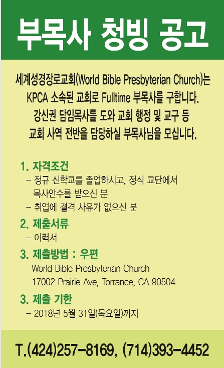 세계성경장로교회 (World Bible Presbyterian Church)에서 부목사를 청빙한다. 지원자격은 정규 신학을 공부하고 미국 내 목회에 법적인 결격사유가 없는 이로써, KPCA 교단에 가입하는데 결격사유가 없어야 한다. 제출서류는 학력과 경력을 증명할 수 있는 이력서와 자기소개서를 제출하면 된다. May 12, 2018 12:57 AM PDT