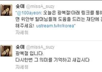 15일 걸그룹 미쓰에이 수지의 개념 발언이 네티즌들의 이목을 집중시켰다.광복절을 맞은 이날 수지는 자신의 트위터를 통해 백아연의 트윗을 리트윗하며 "광복절입니다. 다시 한번 그 의미를 기억하고 새깁시다"라고 올려 팬들과 함께 광복절 의미를 되새기자는 취지의 Aug 15, 2013 01:03 PM PDT