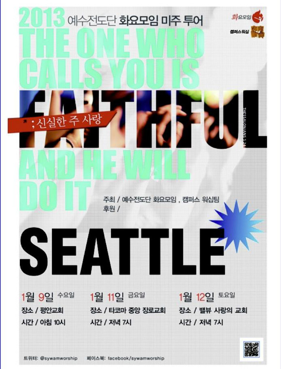 시애틀 청년들에게 하나님의 사랑과 성령의 임재를 전할 '예수전도단 캠퍼스 워십 시애틀 집회'가 오는 1월 9일(수) 오전 10시 평안교회(담임 강성림 목사), 1월 11일(금) 저녁 7시 타코마중앙장로교회, 1월 12일(토) 저녁 7시 벨뷰 사랑의교회(담임 조영훈 목사)에서 각각 열린다. Dec 19, 2012 04:55 AM PST