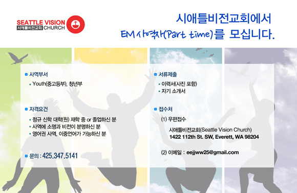 시애틀 비전교회(담임 권혁부 목사)에서는 파트타임 EM 사역자를 청빙한다. 사역 부서는 유스 중고등부와 청년부이며, 자격 조건은 정규 신학 대학 또는 대학원에 재학 중이거나 졸업한 자이다. 또 이중언어와 EM 사역에 대한 소명과 비전을 가진자 이다. Nov 16, 2012 12:46 AM PST
