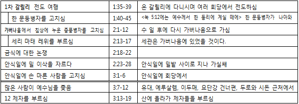 예수님의 1차 갈릴리 전도에서 주요한 점은 제자들을 부르신 것, 찾아오는 무리들 중에 약한 자들을 고치신 것, 그리고 종교 지도자들과의 안식일 논쟁으로 정리할 수 있다. 이런 관점은 예수님의 주변 인물들을 세 구조로 나누어볼 수 있다. 사도들, 무리들, 그리고 바리새인들과 서기관들을 중심으로 한 종교 지도자들이다. Sep 14, 2012 11:08 AM EDT