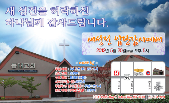 훼드럴웨이 등대교회(담임 박요한 목사)가 새성전을 마련하고 오는 20일(주일) 오후 5시 입당 감사예배를 드린다. 이번 등대교회가 새로 입당하는 건물은 예전에 나이트클럽과 카지노로 사용되던 건물로, 구입 후 3개월간의 리모델링을 거쳐 '하나님의 집'으로 탈바꿈하게 됐다. May 11, 2012 06:50 AM PDT