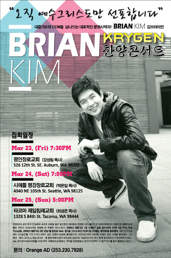 대중가요와 CCM을 넘나들며 ‘하나님만이 나의 전부'라고 고백하는 1.5세 김브라이언의 찬양 콘서트가 오는 23일(금) 부터 25일까지 훼드럴웨이 인근 어번, 시애틀, 타코마에서 열린다. Mar 07, 2012 08:17 AM PST