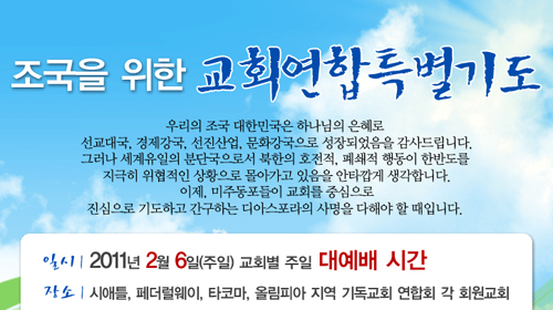 워싱턴주 한인교회연합회(회장 구자경 목사)는 오는 2월 6일 주일 예배시 워싱턴주 모든 한인 교회에서 진행 될 “조국을 위한 특별 구국 기도회” 설교 본문과 내용을 발표하고 워싱턴 지역 각 한인교회의 협력을 당부했다. 워싱턴주 한인교회연합회는 이번 조국을 위한 특별기도회 설교 본문은 에스겔 22장 30-31절이며, 설교 제목은 ‘지금은 한국교회와 나라를 위하여 기도 할 때입니다’라고 밝혔다. 워싱턴주 한인교회연합회는 오는 2월 7일(월)부터 12일(토)까지를 조국을 위한 기도 기간으로 선포하고 각 교회가 특별기도, 금식기도,철야기도, 새벽기도 등 교회 일정에 맞게 시행할 것을 공포했다. 아래는 워싱턴주 한인교회연합회에서 전해온 기도 제목과 설교문 Jan 19, 2011 02:52 PM PST