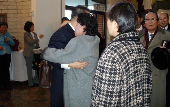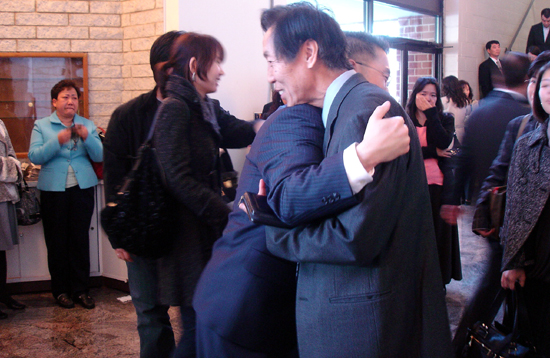 | ▲예배후 교인들과 일일이 인사를 나누는 고성삼 목사 | |