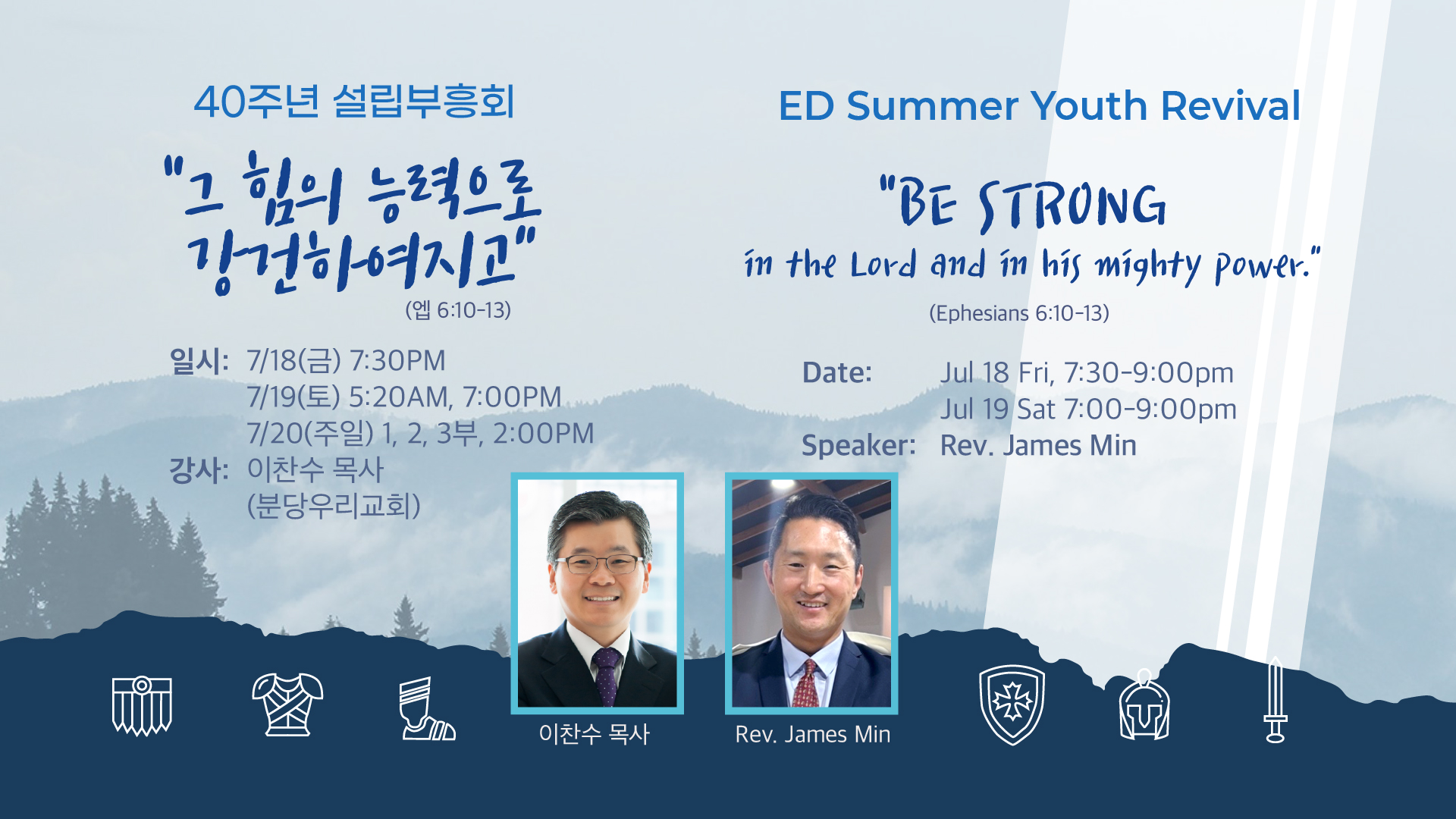충현선교교회 설립 40주년을 맞이하여, 7월 18일부터 20일까지 분당우리교회 이찬수 담임목사를 강사로 초청해 “그 힘의 능력으로 강건하여지고”(엡 6:10-13) 주제로 7월 18일(금) 저녁부터 20일(주일)까지 부흥회를 개최한다.