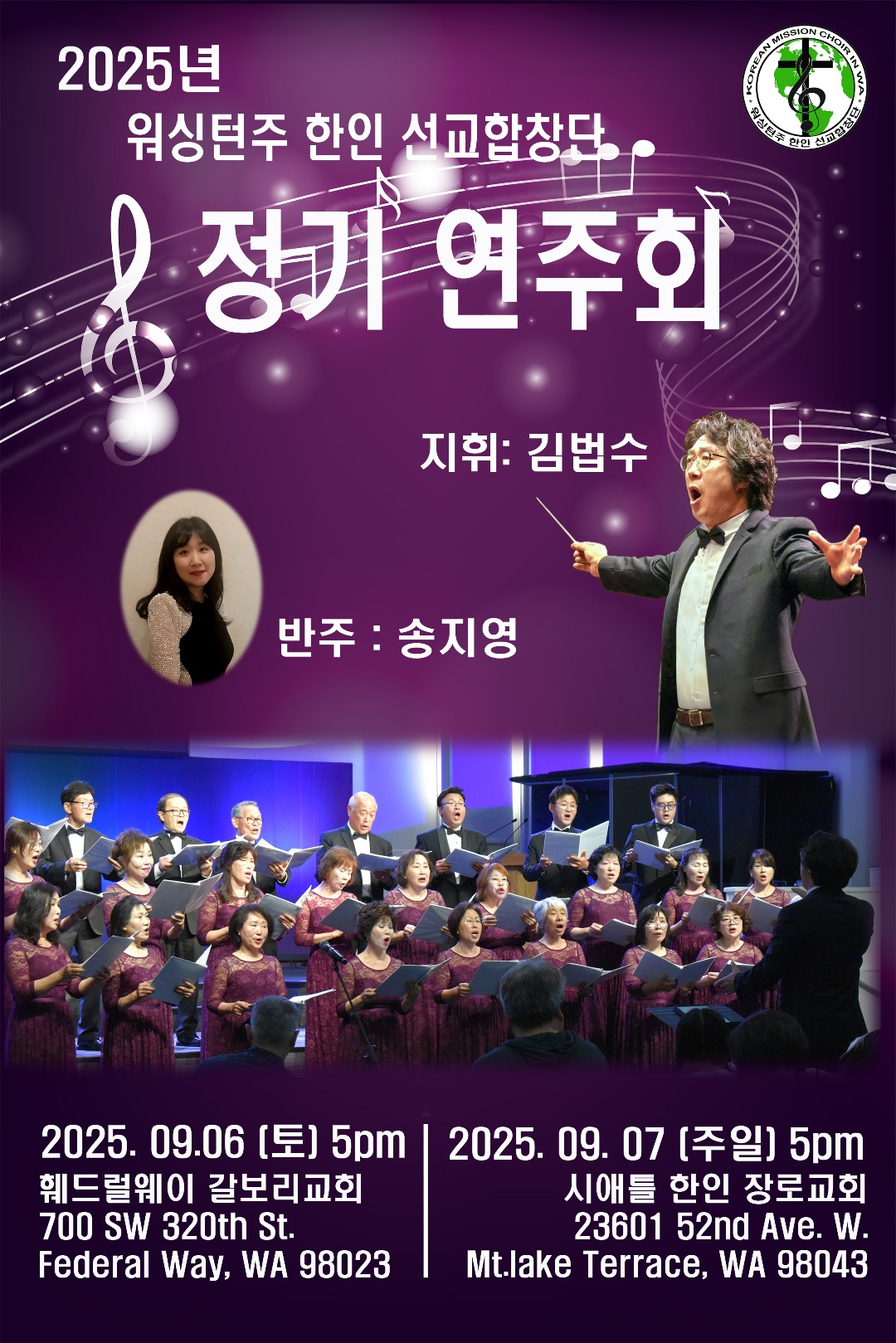 2025년 워싱턴주 한인 선교합창단의 정기연주회가 9월6일(토)과 9월7일(주일) 오후 5시에 각각 훼드럴웨이 갈보리교회, 그리고 시애틀 한인장로교회에서 열린다.