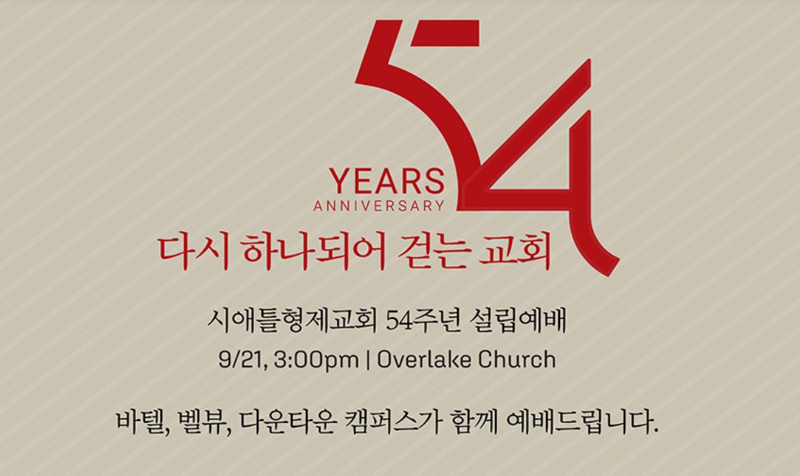 시애틀 형제교회(담임 권준 목사)가 창립 54주년을 맞아 오는 9월 21일(주일) 오후 3시, 레드몬드에 소재한 오버레이크교회(Overlake Christian Church)에서 연합예배를 드린다.