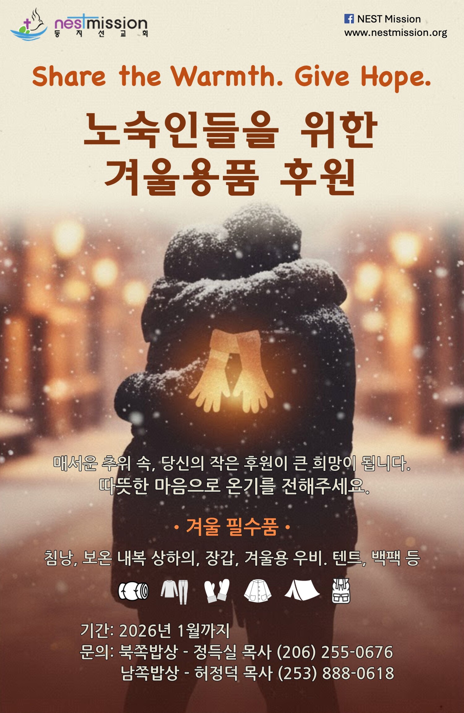워싱턴주에서 노숙자 선교를 활발하게 펼치고 있는 둥지선교회(Nest Mission)가 워싱턴주 한인 교회와 성도들에게 노숙인들을 위한 겨울 용품과 사랑의 후원을 요청했다.