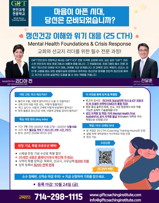 이러한 시대적 요청에 응답하여, GIFT 전인코칭전문학교가 ‘정신건강 이해와 위기 대응(Mental Health Foundations & Crisis Response)’ 과정을 개설했다. 이 과정은 단순한 심리교육이 아니라, 목회와 선교 현장에서 즉시 활용할 수 있는 실제적 위기 대응 훈련으로 구성되어 있다."고 밝혔다.