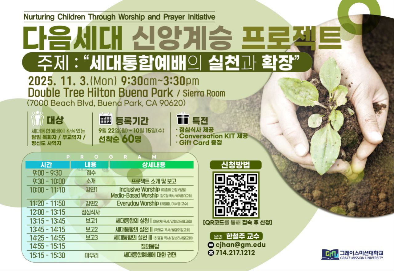 플러튼에 위치한 그레이스미션대학교가 다음세대 신앙계승 프로젝트의 세 번째 단계로 ‘세대통합예배의 실천과 확장을 위한 컨퍼런스’를 개최한다.