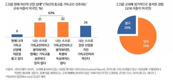주요 결과를 보면 교회에 다니지 않지만 스스로를 '기독교인'이라고 인식하는 이들 중 63%는 '비실천적·비독실 신앙' 범주에 속했다. 언처치드(Unchurched, 교회에 출석하지 않는 사람) 3명 중 2명 가까이가 기독교 정체성은 유지하되 실천으로 이어지지 않는 그룹이었다는 것이다.