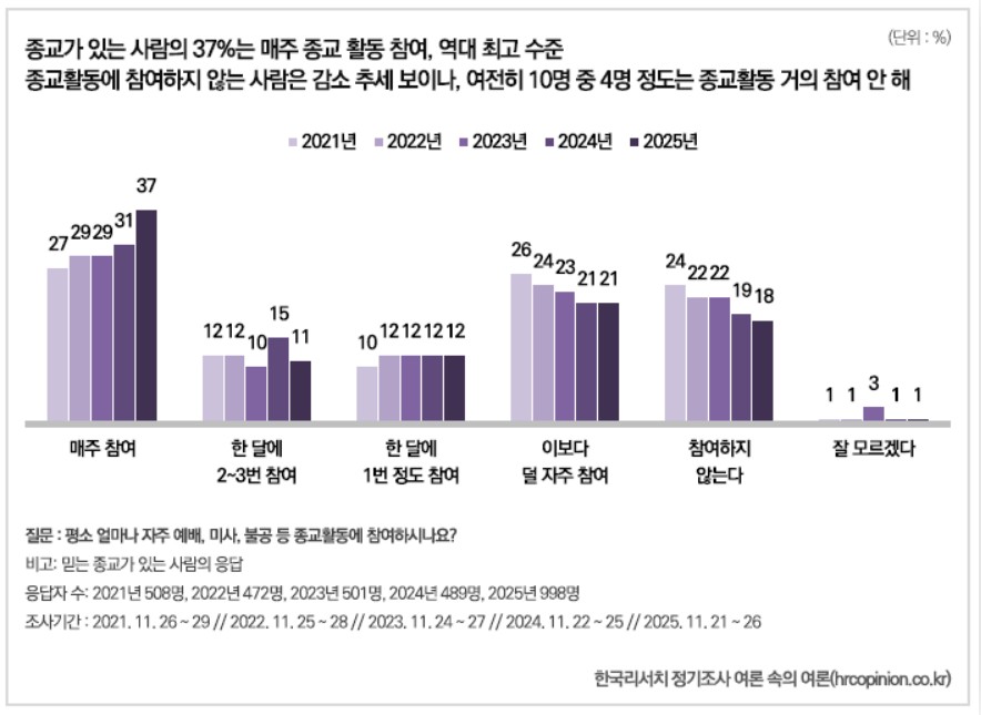 한국리서치 2025년 종교 인구 조사 결과, 매주 종교 활동에 참여한다는 비율이 역대 최고를 기록, 영국처럼 코로나 이후 '조용한 부흥'이 일어날지 관심이 모아진다.