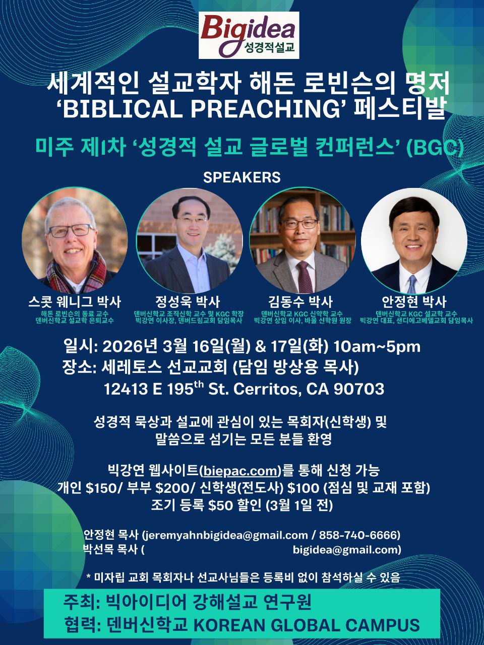 스피커로는 스콧 웨니그 박사(해돈 로빈슨 동료교수, 덴버신학교 설교학 은퇴교수), 정성욱 박사(덴버신학교 조직신학 교수 및 KGC 학장, 빅강연 이사장, 덴버드림교회 담임), 김동수 박사(덴버신학교 KGC 신약학 교수, 빅강연 상임이사, 바울신학원 원장), 안정현 박사(덴버신학교 KGC 설교학 교수, 빅강연 대표, 샌디에고벧엘교회 담임)이 주 강사로 나선다.