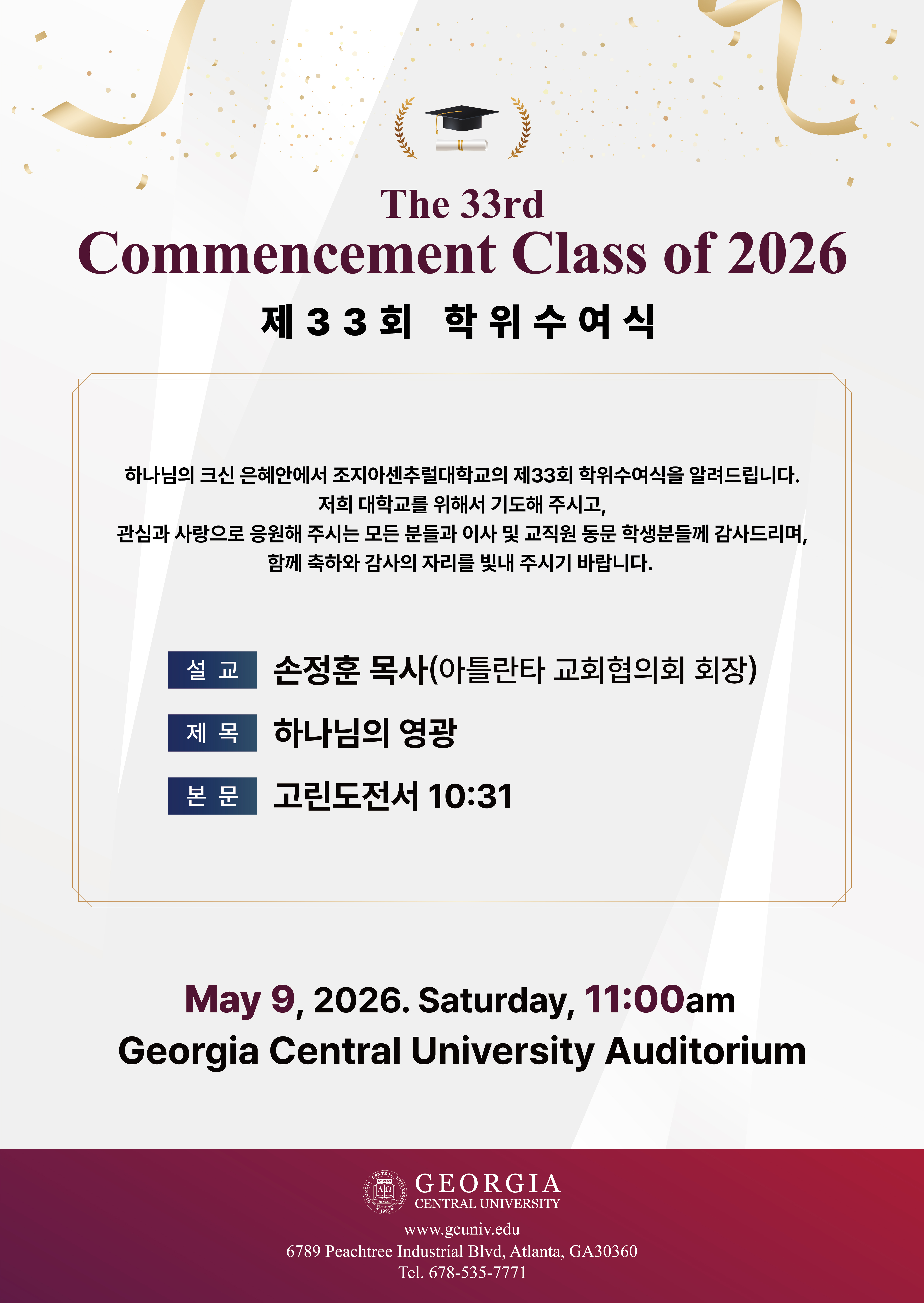 조지아센추럴대학교 (총장 김창환 박사)에서 제33회 학위수여식이 열린다. 오는 5월 9일(토) 오전 11시, 본교 오라토리움에서 열리는 이번 학위수여식에는 애틀랜타 교회협의회 회장인 손정훈 목사가 ‘하나님의 영광’을 제목으로 설교한다.