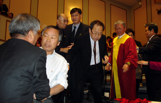 ▲투표에 앞서 발언을 하려는 이와 말리는 이들로 몇번의 마찰을 빚기도 했다.
