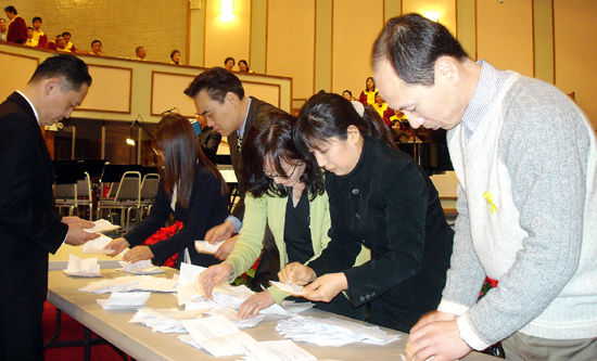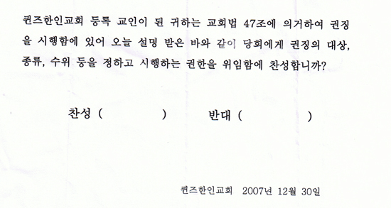 투표여부를 놓고 다양한 의견이 제시됐으며 발언을 하려는 이와 말리는 이들간의 마찰이 빚어지기도 했으나, 예정대로 '퀸즈한인교회 등록 교인이 된 귀하는 교회법 47조에 의거하여 권징을 시행함에 있어 오늘 설명받은 바와 같이 당회에게 권징의 대상, 종류, 수위 등을 정하고 시행하는 권한을 위임함에 찬성합니까?'란 물음에 대한 투표를 진행했다.