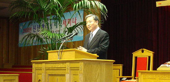 ▲이승재 목사는 제직들에게 '빈손으로 왔다가 빈손으로 가는 인생(욥1:21)'이란 제목으로 제직의 자세와 올바른 헌신에 대해 강의했다.