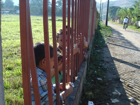 ▲온두라스는 치안이 좋지 못한 나라다. 이에 엘 까스따뇨 크리스천 스쿨과 누가 앤드류 클리닉 주변은 철저하게 보호막으로 둘러쌓여 있다. 이 철 담장 넘어 동네 가게가 있기에 어린이들이 과자를 사먹기 위해 가게쪽을 향해 보고 있다.