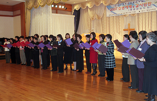 | ▲사모들과 여동문들이 신년예배 특송을 하고 있다. |