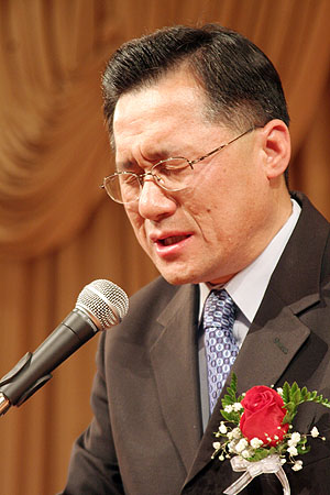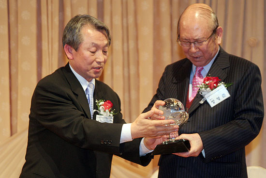 | ▲동문들을 대표해 조명철 총 동문회장이 장영춘 목사(동부개혁장로회신학교 교장)에게 감사패를 전달 하고 있다. |