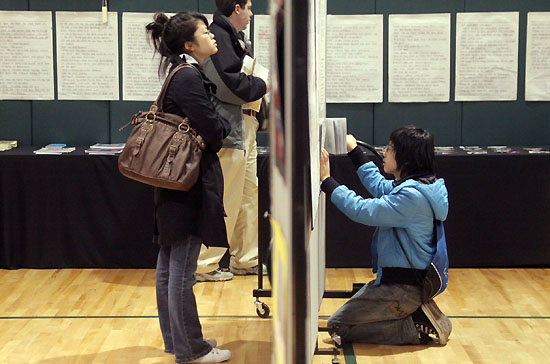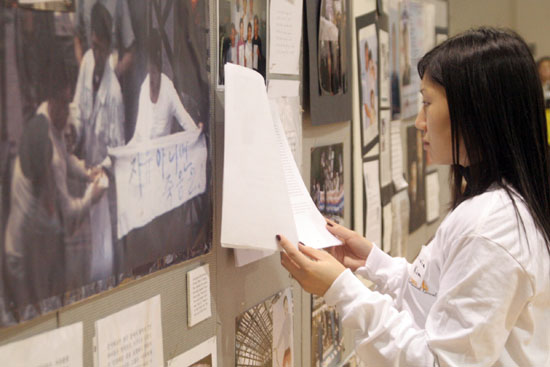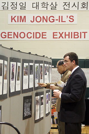 쏠트(PSALT) 주최 '1907년 부흥성회 100주년 : 성찰과 부활'대회가 2박 3일의 일정으로 뉴저지 연합 감리교회(담임 나구용 목사)에서 진행되고 있다. 대회 둘째날인 13일, 행사장 한편에 마련된 부스에서는 '김정일 대학살 전시회'가 열리고 있다.