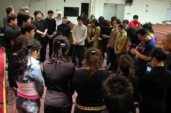 | ▲The Praise Night이 끝난 후 함께 은혜를 나누고 마침기도를 하고 있다. | |