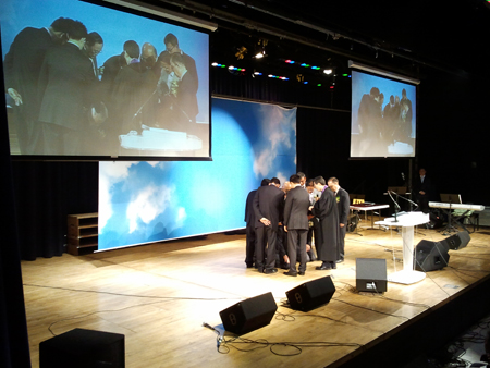 | ▲안수위원들이 임직자 머리 위에 손을 얹고 안수하고 있다. | |