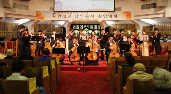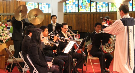 이날 예배의 음악반주는 스트링이 없는 관악기와 심벌즈까지 동원되어 우렁찬 금관악기의 소리가 새로운 출발을 의미하기도 했다.