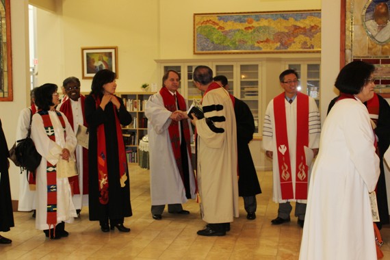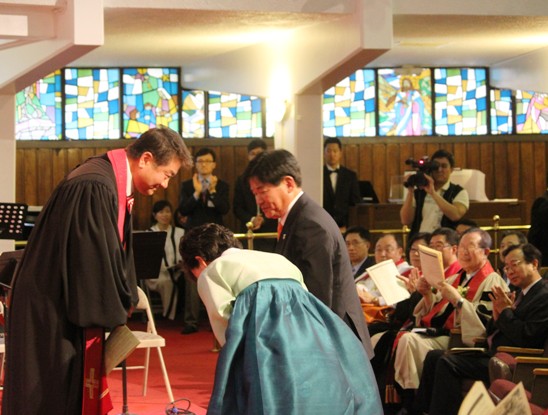 죤 쇼올 감독이 집례한 취임 예식 마지막 순서로 남,여 선교회 회장이 영대(Stole)를 목사의 어깨에 둘러 주었다. "목사님이 우리에게 오심을 환영하며 축하합니다.이 영대를 받으시고우리의 목자가 되어 주십시오"