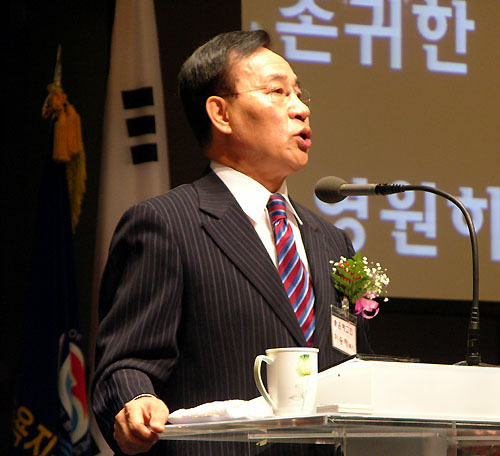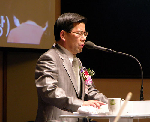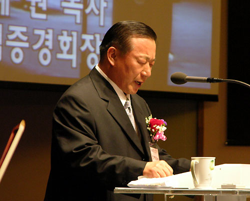 | ▲뉴저지교회협의회 회장 허상회 목사가 축사를 전하고 있다. | |