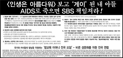 동성애를 다루고 있는 SBS TV 드라마 <인생은 아름다워> 김수현 작가가 바른 성문화를 위한 전국연합(바성연)과 참교육 어머니 전국 모임 등이 한 일간지에 낸 광고에 대해 자신의 트위터에 “웃음도 안 나오네요”라는 반응을 나… 감리교 본부측, 총실위 개최 무산
