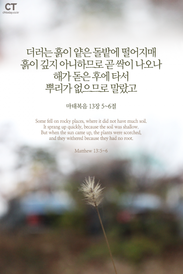 더러는 흙이 얕은 돌밭에 떨어지매 흙이 깊지 아니하므로 곧 싹이 나오나 해가 돋은 후에 타서 뿌리가 없으므로 말랐고