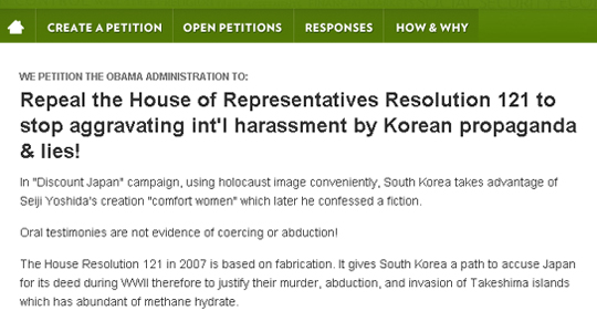 지난 5월 일본군 위안비 기념비 철폐 관련 청원서에 목표 서명 이상을 받아낸 일본인들이 최근 백악관 웹사이트를 통해 ‘위안부 결의안(HR 121)’의 폐기를 요청하는 청원서 서명을 모으고 있다. 마감일이 이번주로 임박한 가운…