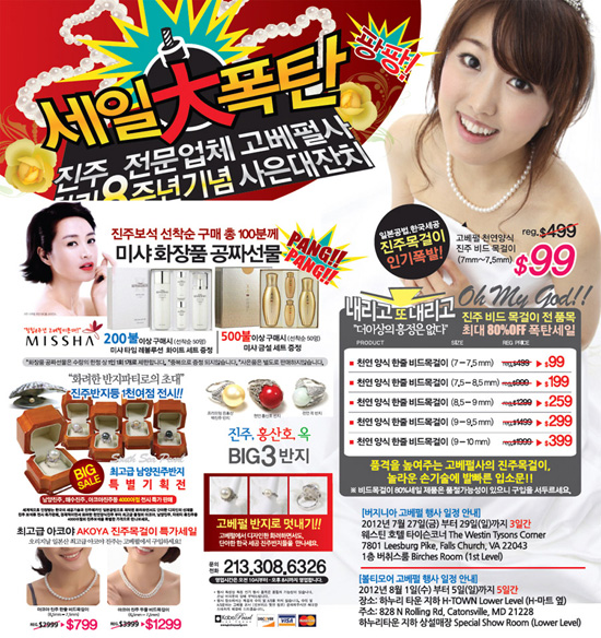 진주전문 고베펄 사가 올해 창립 8주년을 맞이 최대 진주보석 대축제를 오는 7월 27일(금)부터 29일(일)까지 3일동안 타이슨스 코너 웨스틴 호텔(The Westin Tysons Corner)에서 열기로 하고, 고급 화장품 공짜선물에다 진주비드 목걸이와…