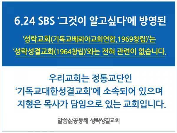 성락성결교회(담임 지형은 목사)에서 "6월 24일 <그것이 알고싶다>에 방영된 성락교회(기독교베뢰아교회연합)는 성락성결교회와 전혀 관련이 없다"고 밝혔다.