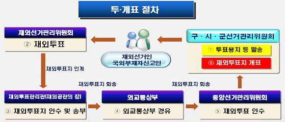 재외선거인이나 국외부재자신고인은 선거관리위원회가 발송한 투표용지 등을 가지고 공관이나 공관대체시설에 설치된 재외투표소에 가서 투표하여야 하며, 기표된 재외투표지는 구․시․군선거관리위원회로 보내져 선 메릴랜드기독교지도자협의회 신년 조찬기도회