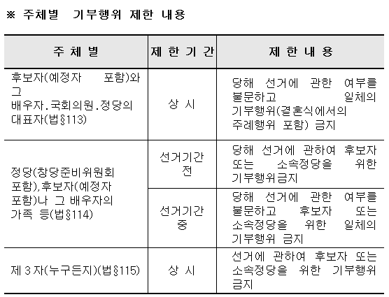 대한민국은 선거와 관련한 기부행위를 엄격히 제한하고 있습니다