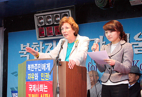 세찬 비가 내리고 4월답지 않게 추운 날씨 속에서도 이날 집회에는 탈북자와 인권운동가, 국민 등 2백여명이 참석해 북한인권의 개선을 촉구했다.