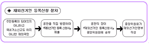 대한국민 내에 주민등록이 되어 있지 아니하고 국내거소신고도 하지 아니한 재외국민으로서 외국에서 투표하려는 선거권자는 대통령선거와 임기만료에 따른 국회의원선거를 실시하는 때마다 반드시 공관을