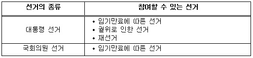 대통령선거는 임기만료에 따른 선거뿐 만 아니라 궐위로 인한 선거, 재선거에도 투표권을 행사할 수 있고, 국회의원선거는 임기만료에 따른 선거에 한하여 투표권을 행사할 수 있습니다
