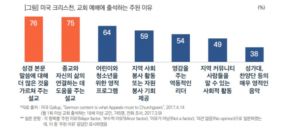미국의 기독교인들이 교회에 출석하는 큰 이유로 ‘목사의 설교 내용’을 꼽았다. 목회데이터연구소(대표 지용근)는 지난 5일 ‘주간 리포트’에서 2017년 미국 갤럽(Gallup)의 설문 결과를 소개했다. 이에 따르면 ‘미국 크리스천…