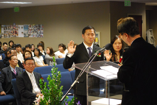 한비전아틀란타교회(담임 이태호 목사) 한동윤 전도사가 7일 목사안수예배를 드리고 목사의 길을 서약했다. 이날 교회의 든든한 일군이 소명을 받아 목사의 길에 들어서는 거룩한 자리에 모인 교단 관계자들과 축하객들은 아낌…