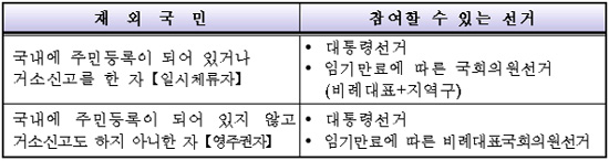 선거권이 있는 모든 재외국민은 대통령선거와 임기만료에 따른 비례대표국회의원선거에 투표할 수 있으며 국내에 주민등록이 되어 있거나 거소신고를 한 사람은 임기만료에 아이티 돕기 위해 남가주 교계 나섰다