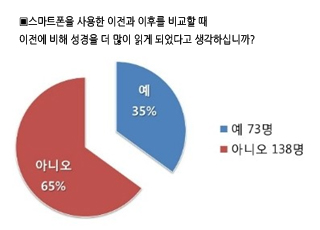팻머스문화선교회(대표 선량욱)가 2월 11일부터 18일까지 기독교인 216명을 대상으로 '스마트폰이 기독교인의 신앙생활에 미치는 영향'을 조사하기 위해 설문을 진행했다. 그 결과 응답자의 71%가 성경책을 대신하여 성경 어플리… IS 대원, 죽음의 문턱에서 영적 체험 후 기독교로 개종